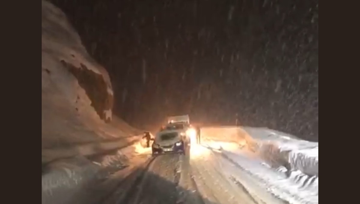 Hakkari'nin Yüksekova ilçesinde etkili olan yoğun kar yağışı ve tipi hayatı olumsuz etkilerken, karayolunda mahsur kalan bir vatandaşın fırtınaya rağmen namaz kıldığı anlar cep telefonu kameralarına yansıdı.