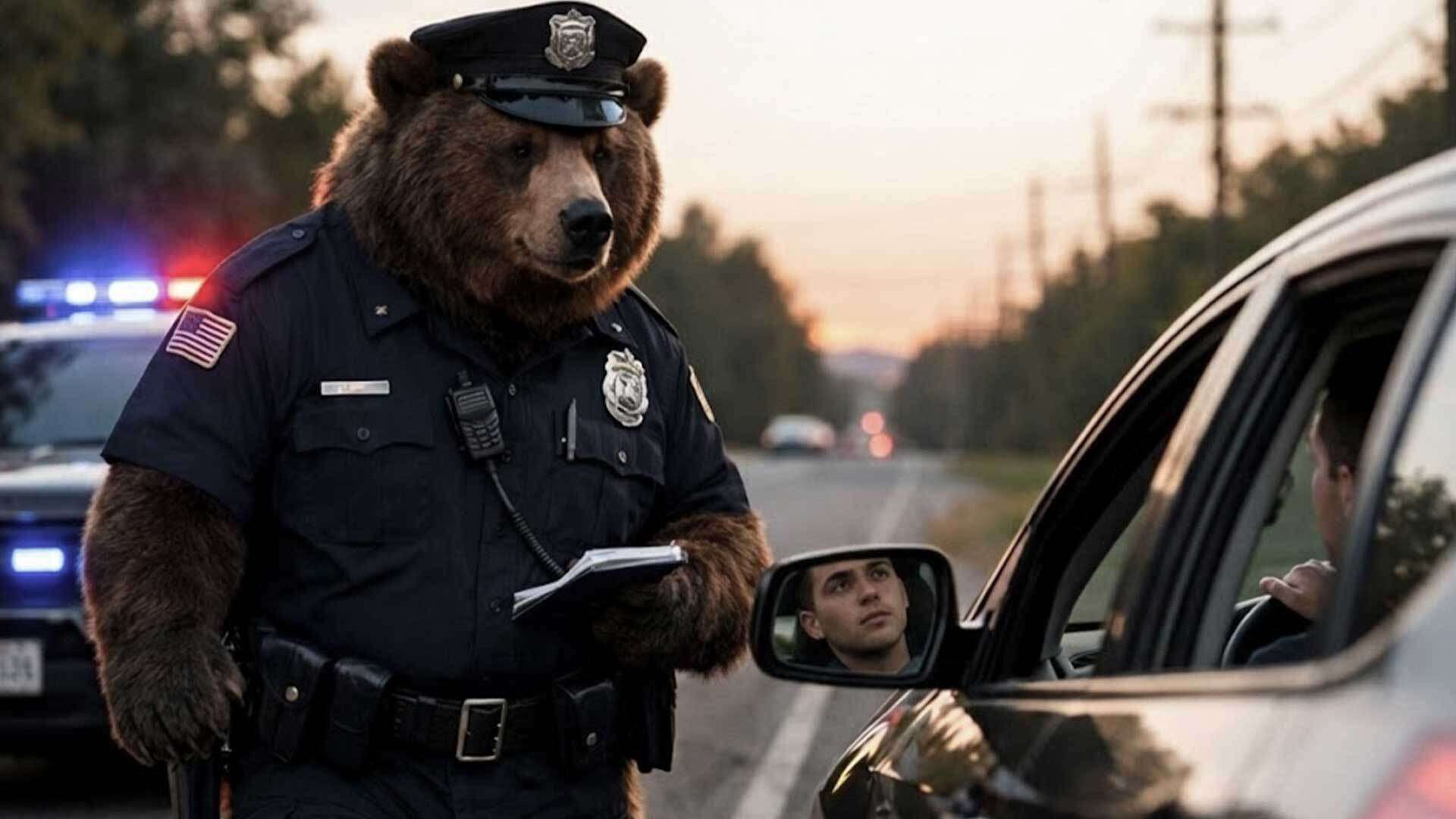 A bear in a police uniform approaches a car on the side of a road.