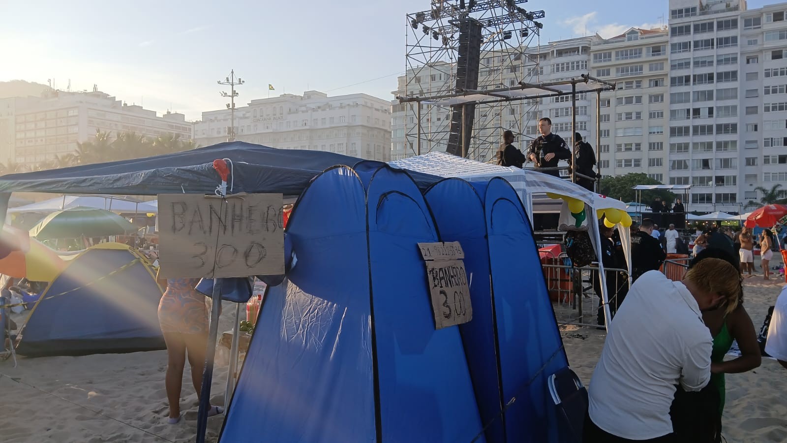 A faixa de areia da Praia de Copacabana, especialmente a área próxima ao Palco Rio do réveillon 2026, já estava tomada por barracas de acampamento e tendas improvisadas no fim da tarde desta terça-feira. Por volta das 18h, famílias inteiras ocupavam o espaço com estruturas montadas diretamente na areia, transformando o entorno do palco principal em uma espécie de área de camping informal. Ainda na areia, uma equipe do GLOBO flagrou a existência de um banheiro improvisado, montado com lonas sob uma dessas tendas. Presa à estrutura, uma placa anunciava o serviço: “Banheiro 4 reais só aqui”. Mais a frente, em outra barraca usada como banheiro, o preço é um pouco mais em conta: R$3. A cena contrasta com a megaestrutura oficial montada pela prefeitura no entorno dos palcos. Ao longo da Avenida Atlântica, a poucos metros do local, havia dezenas de cabines de banheiros químicos disponíveis ao público. Todo o cenário foi registrado muito próximo a dois mezaninos da Polícia Militar instalados na orla, evidenciando a ocupação intensa da areia já nas horas que antecedem a festa da virada.