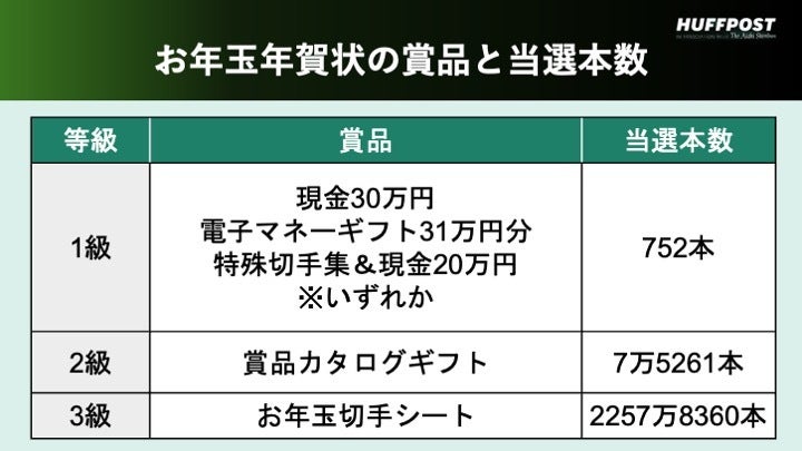 お年玉年賀状の賞品と当選本数 2026(令和8)年のお年玉付き年賀状と切手の抽選が1月19日(月)に 行われます 。 当選番号は同日、日本郵便の公式サイトで発表される予定です。 賞品内容と交換方法をまとめました。 賞品内容は? ▽1等(※752本)100万本に1本 現金30万円 または、 選べる電子マネーギフト「EJOICA(イージョイカ)セレクトギフト」31万円分 または、 2025年発行特殊切手集&現金20万円 ▽2等(※7万5261本)1万本に1本 賞品カタログギフト ▽3等(※2257万8360本)100本に3本 お年玉切手シート ※1等・2等・3等の当選本数は、2026(令和8)年用年賀はがきの当初発行枚数と寄付金付年賀切手の発行枚数の計7億5261万2000枚から算出した数字。 賞品の交換方法と引き換え期間 いずれの賞も、年賀はがき・切手のくじ番号部分を切り取らずに、郵便局に持参してください。 引き換え期間は2026年1月20日(火)から7月21日(火)までとなっています。 関連記事 【2026年の祝日カレンダー】5連休が2回で、9月のシルバーウィークが11年ぶり復活。ゴールデンウィークはいつ?(一覧) 2026年のNISAはどうなる?鍵握る自民党税調がスタート。「こどもNISA」など3つのポイントを解説 「2026年の色」が発表⇨情報過多で疲れた現代人の心の声を反映していた ...クリックして全文を読む