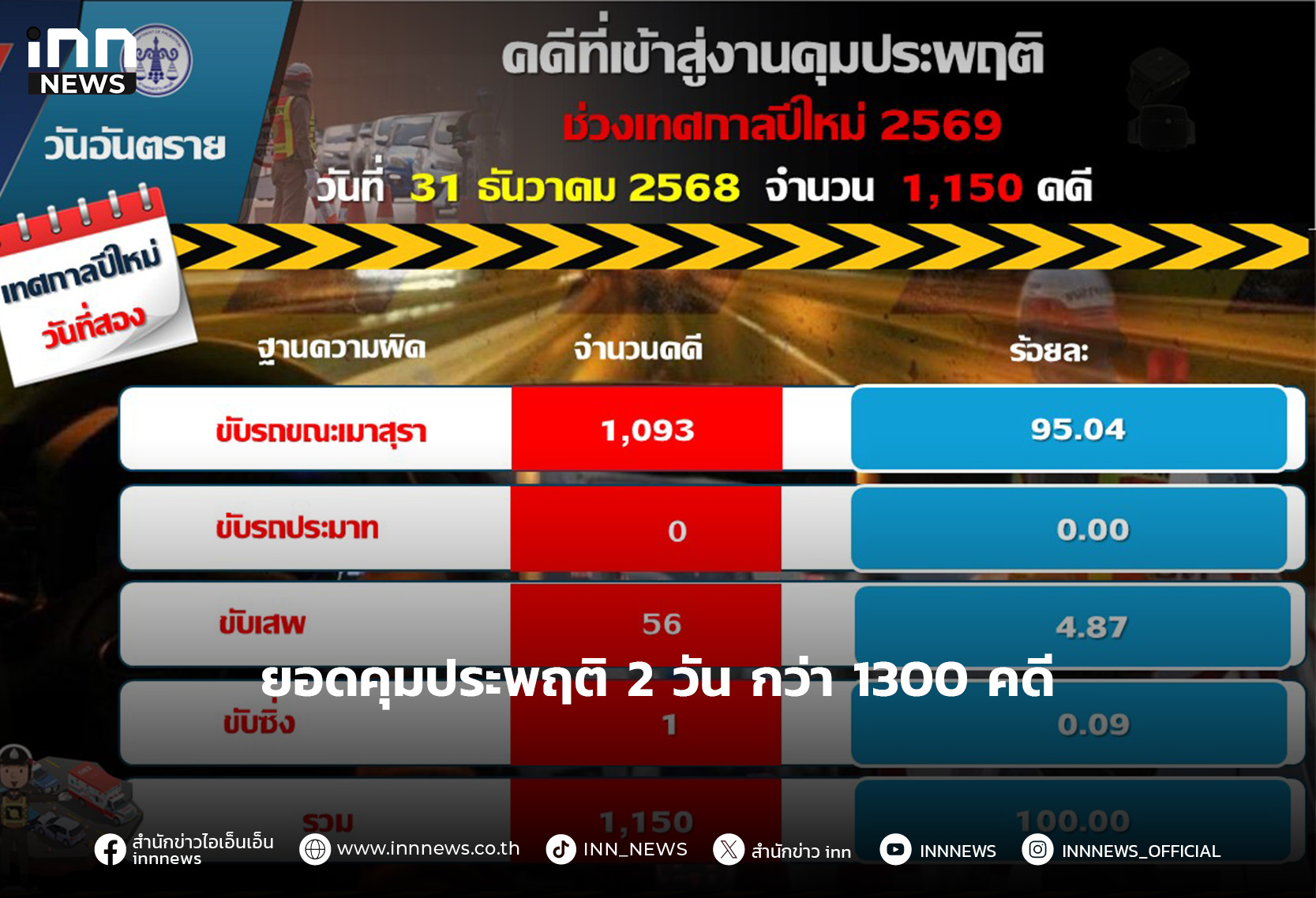 กรมคุมประพฤติเผยสถิติคดีเมาแล้วขับ คืนส่งท้ายปี ยังพุ่ง สะสม 2 วัน 1,366 คดี