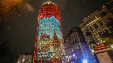علق أعضاء في "وقف الشباب التركي"، الكوفية الفلسطينية برج غالاطة التاريخي في مدينة إسطنبول، بهدف تسليط الضوء على الإبادة الإسرائيلية بحق الشعب الفلسطيني في قطاع غزة.