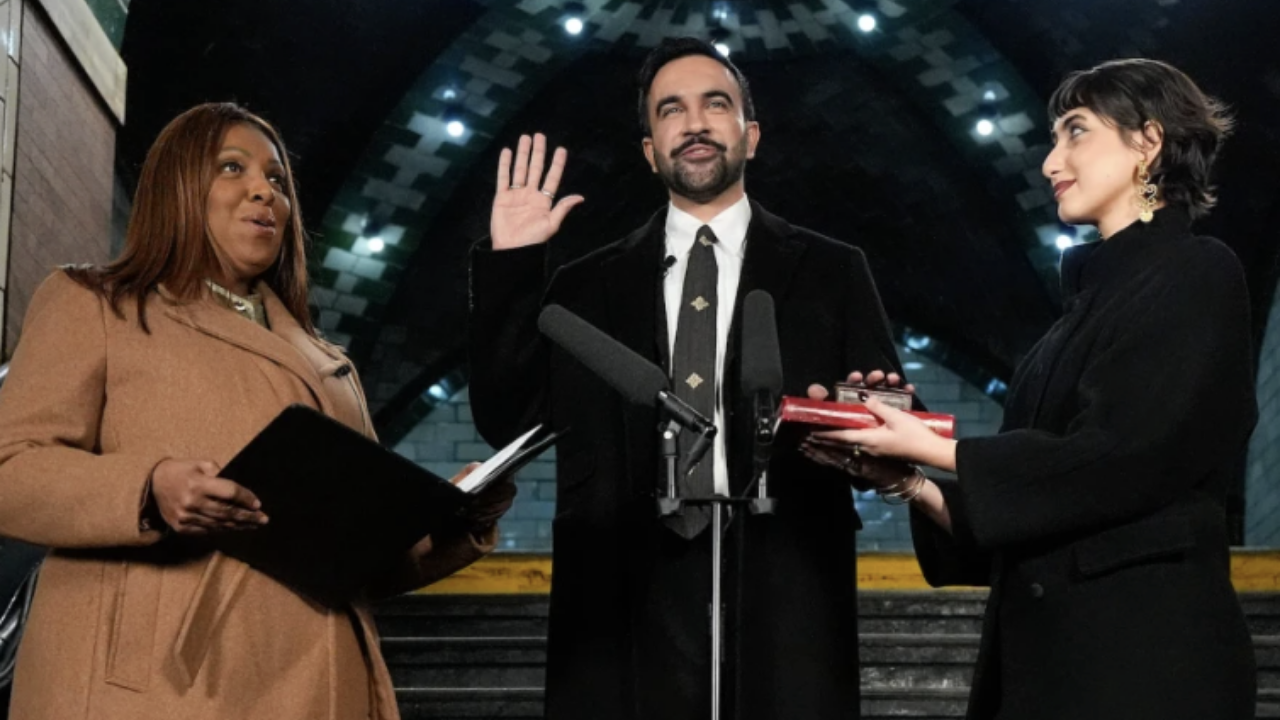 New York’un seçilmiş belediye başkanı Zohran Mamdani, 1 Ocak 2026’da gece yarısından hemen sonra, City Hall Park’ın altındaki kapalı ve tarihi Old City Hall metro istasyonunda düzenlenen özel bir törenle Kur’an-ı Kerim üzerine el basarak yemin etti.