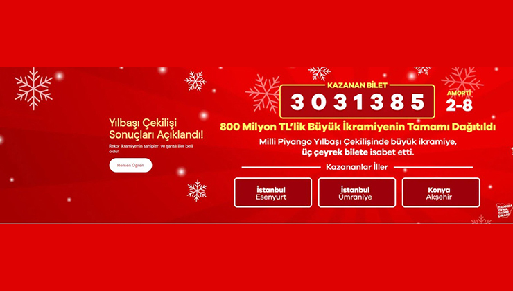 Milli Piyango tarafından düzenlenen yılbaşı özel çekilişinde ikramiye kazanan numaraların listesi açıklandı. Milli Piyango’dan yapılan açıklamaya göre; yılbaşı çekilişinde dağıtım garantili 800 milyon liralık büyük ikramiye 3 adet çeyrek bilete çıktı. Büyük ikramiye 2’nci çekilişte İstanbul’un Esenyurt ve Ümraniye ilçeleri ile Konya Akşehir’den alınan biletlere isabet etti. Çeyrek biletlerin sahipleri, 800 milyon liranın dağıtım garantisi […] The post Milli Piyango’nun büyük ikramiyesi Konya’ya isabet etti first appeared on Yeni Meram - Konya Haberleri - Güncel Ekonomi ve Politika Haberleri .