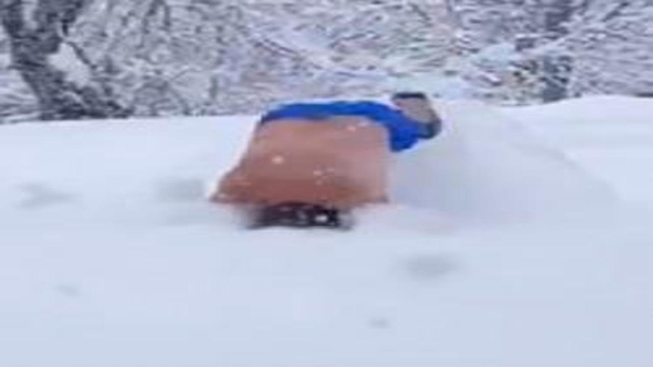 Sakarya’da yaşayan bir kişi, eksi 10 derece soğuğa aldırmadan şortuyla karda adeta yüzdü.