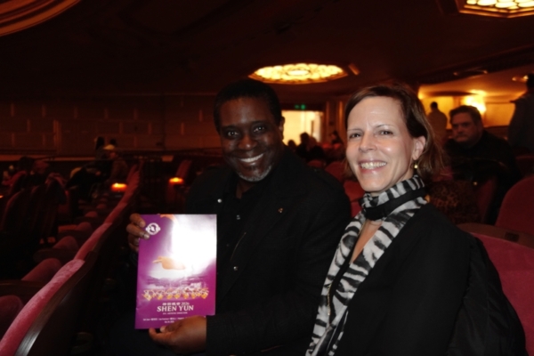 2025年12月31日下午,首席设计师Briget Wettstein和友人James Forde一同观看了神韵北美艺术团在旧金山歌剧院的第一场演出。(曹景哲/大纪元)