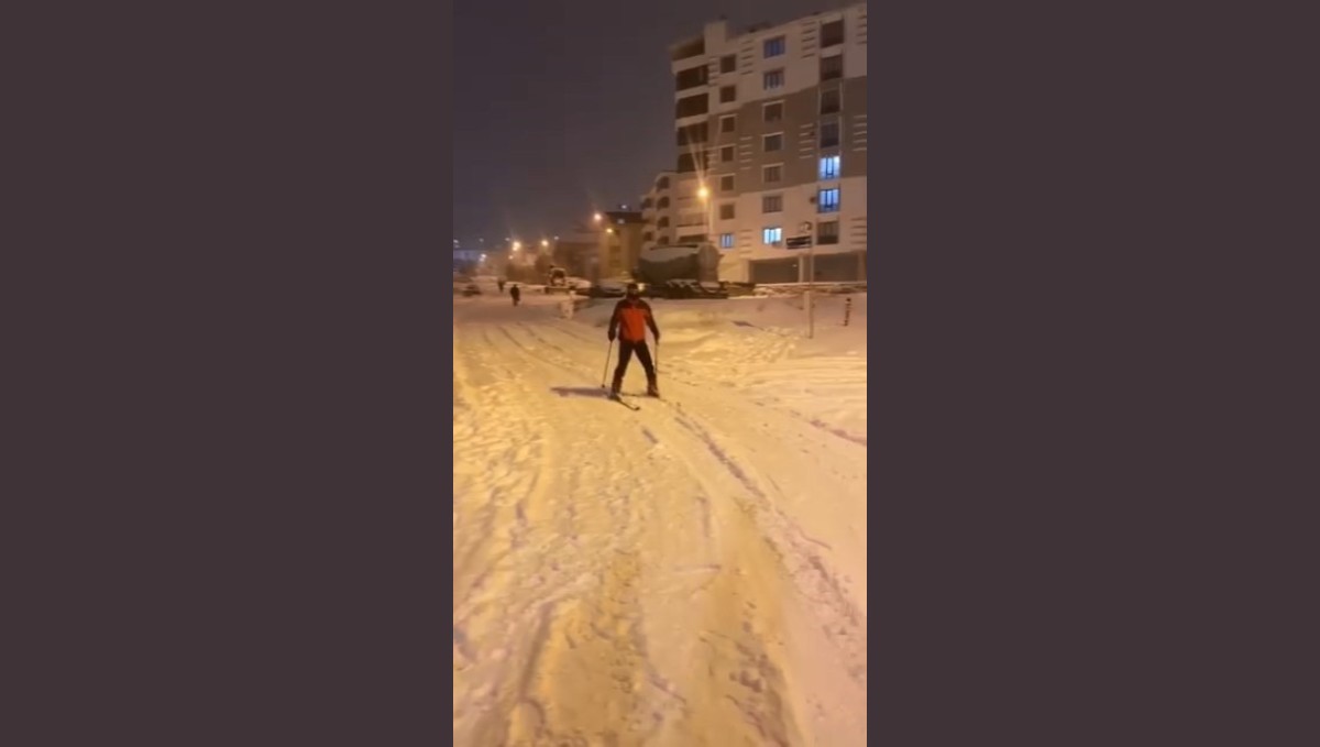 Elazığ'da bir vatandaş, yağan kar sonrası kayak takımıyla caddede gezdi.
