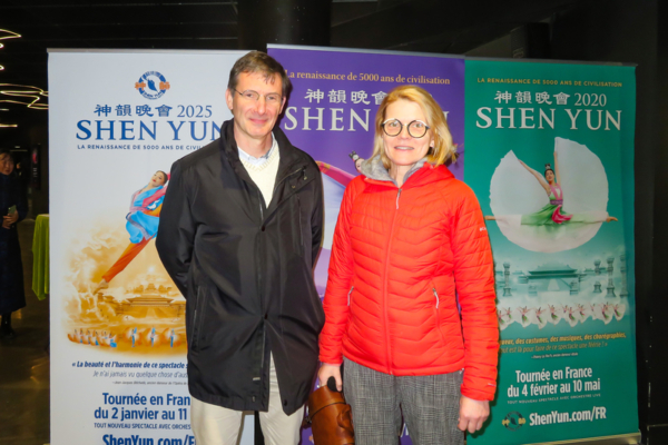 2025年12月31日,波尔多当地一家食品公司的企业管控主管Didier Piton和朋友Anne Rolin观赏了神韵国际艺术团在波尔多阿凯亚剧场(Arkea Arena)的第六场演出(盛明/大纪元)