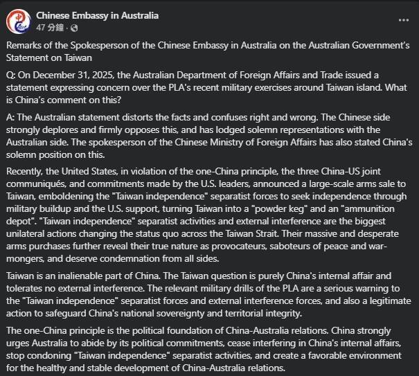 澳洲外交部昨天發聲明譴責共軍環台軍演,並警告軍演「有促使區域緊張升溫的風險」。中國駐澳洲大使館發言人今天聲稱,澳方的聲明混淆是非,已向澳方提出嚴正交涉。 澳洲外交部昨天發布聲明,譴責共...…