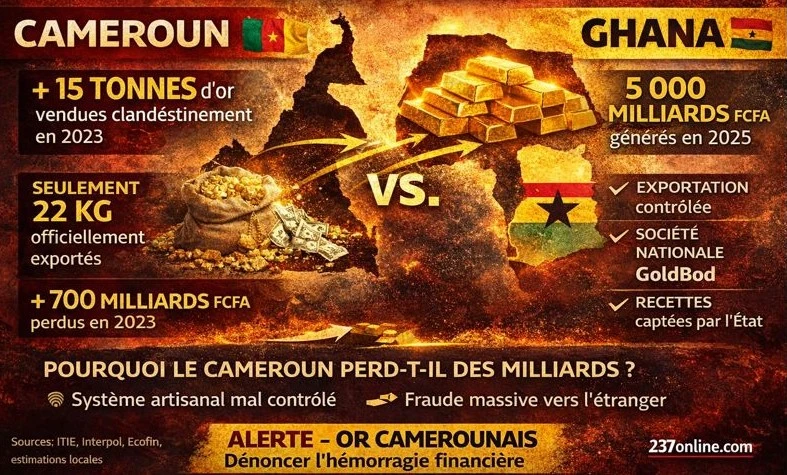 5 000 milliards de FCFA. C’est le montant des recettes générées par l’exportation de l’or artisanal du Ghana en 2025, selon les chiffres publiés par le média économique Ecofin. Pendant que le pays ouest-africain encaisse, structure et trace sa production aurifère, des tonnes d’or camerounais continuent de quitter le territoire sans passer par les caisses […] L’article Cameroun – Or artisanal : le Ghana montre ce que nous perdons est apparu en premier sur 237online.com .