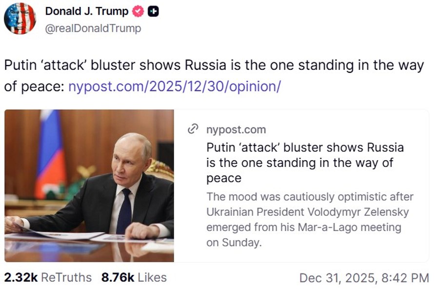În ajunul Anului Nou, președintele american Donald Trump, contrar obiceiului de a transmite mesaje directe, a lăsat de data asta un titlu să vorbească în locul său, și anume restribuind un editoriall din New York Post care îl acuza pe Vladimir Putin că a mințit cu privire la atacul ucrainean.