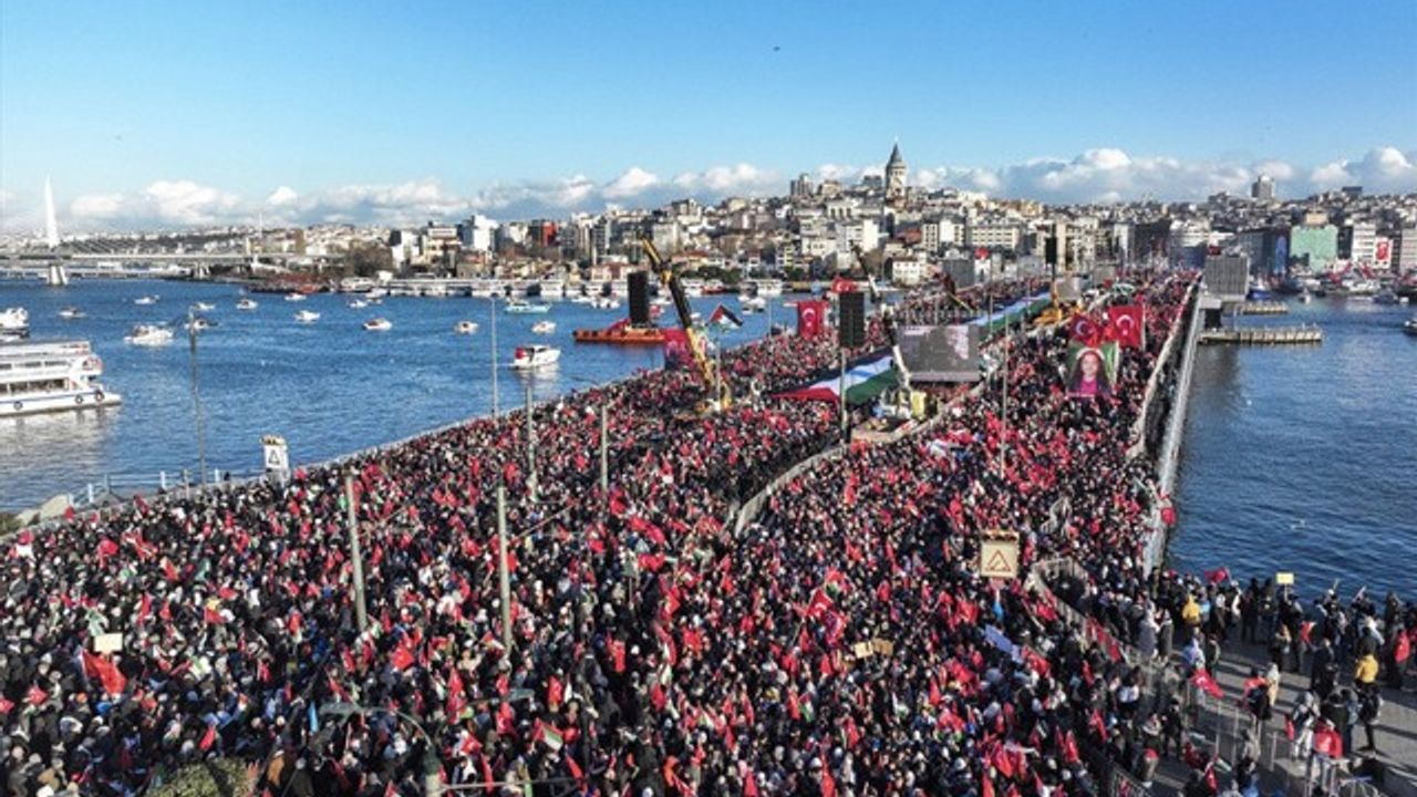 İstanbul’da Galata Köprüsü’nde Filistin’e destek için düzenlenen eylemde emniyet anonsuna göre 520 bin kişi bir araya geldi.