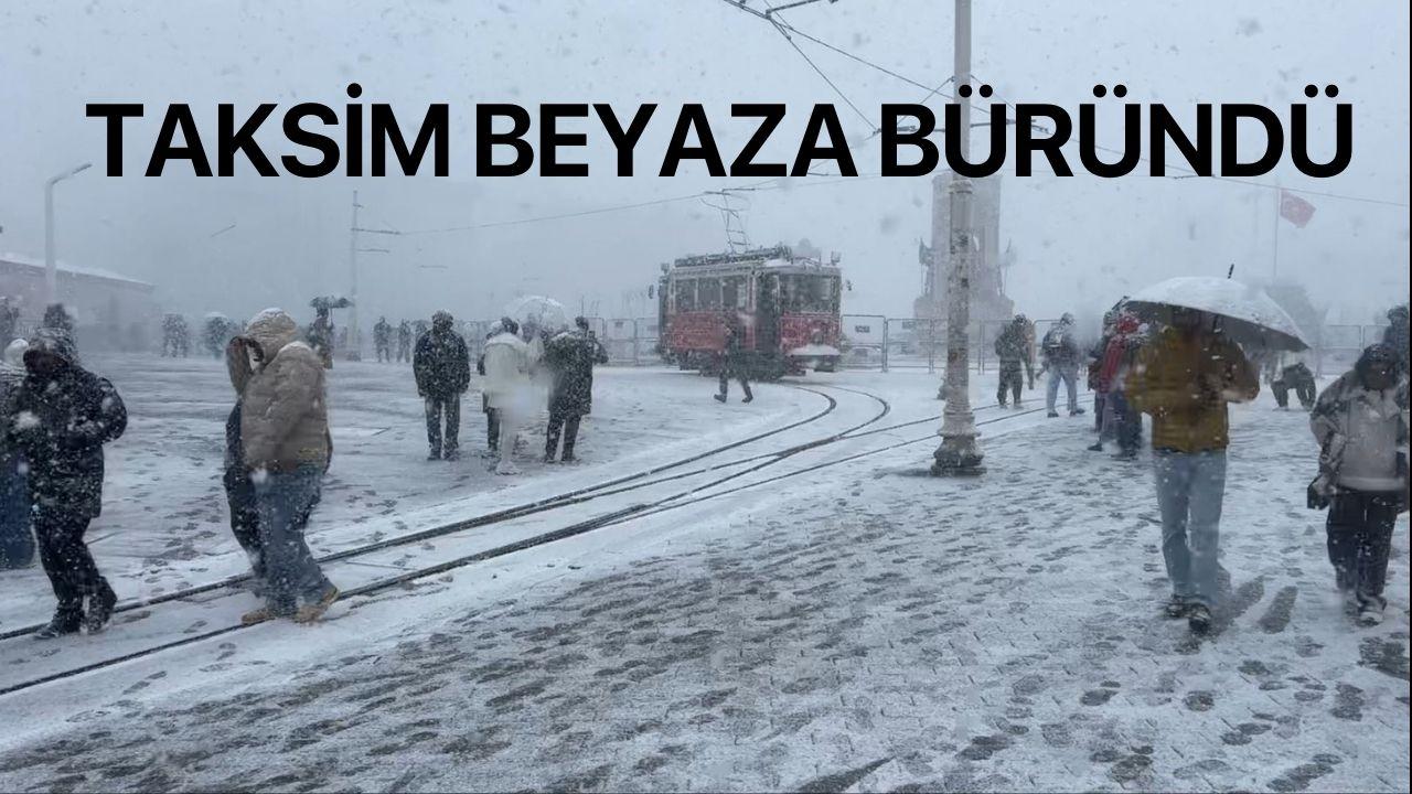 İstanbul Taksim'de etkili olan kar yağışı ortalığı beyaza bürüdü. Karla kaplanan Taksim'in manzarası mest etti.