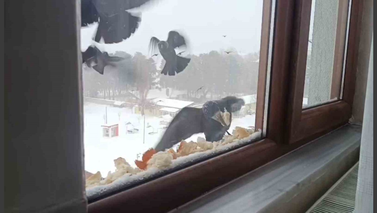 Bitlis'in Tatvan ilçesinde etkili olan olumsuz hava şartları nedeniyle pencerelerinin önüne kuşlar için ekmek bırakan baba ve kızı büyük takdir topladı.