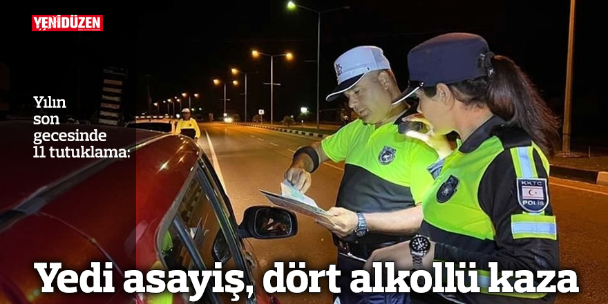 Yılın son gecesinde 11 kişi tutuklandı! Yılın son gecesinde, çeşitli suçlardan yedi, alkollü içki tesiri altında araç kullanıp trafik kazası yapmaktan dört olmak üzere toplam 11 kişi tutuklandı.
