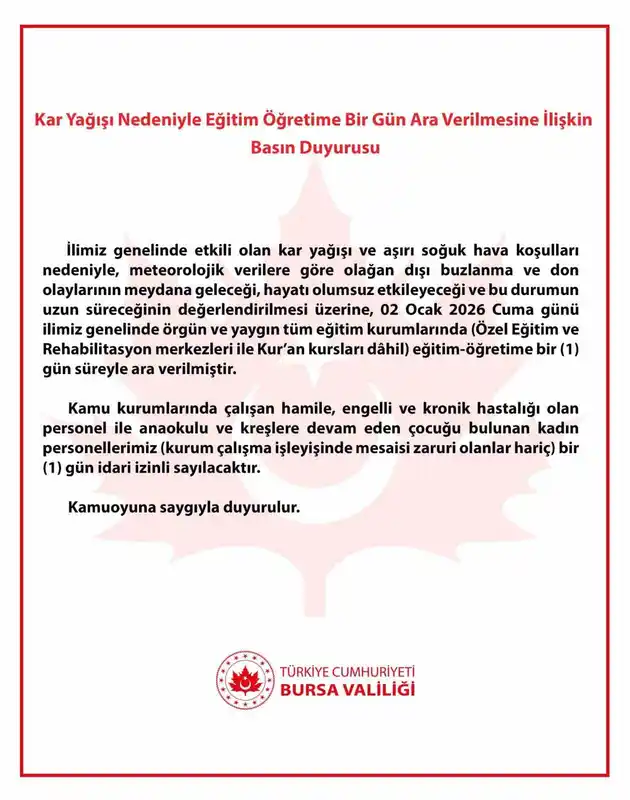 Bursa'da Kar Yağışı Nedeniyle Eğitime Bir Gün Ara Verildi