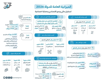 11.4 مليار ريال الإيرادات العامة.. والإنفاق 11.9 مليار - النتائج الأولية للعام المالي 2025: 5 % ارتفاع الإيرادات إلى 11.7 مليار.. و 4% زيادة في الإنفاق إلى 12.2 مليار6.4 مليار...