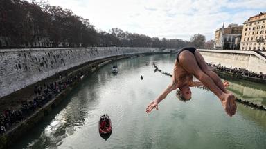 Mitten in der italienischen Hauptstadt setzen heute drei Männer die Tradition des Neujahrsspringens in den Tiber fort. Der Sprung geht 18 Meter in die Tiefe.