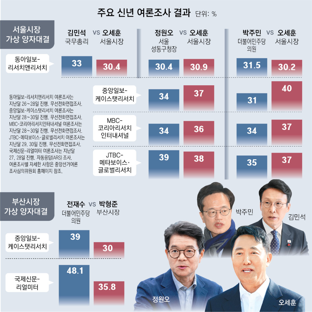 6·3 지방선거가 5개월 앞으로 다가온 가운데 신년을 맞아 발표된 주요 여론조사에서 서울시장 선거는 여야의 팽팽한 접전이, 부산시장 선거는 더불어민주당 후보가 오차범위 밖으로 앞섰다는 결과들이 나왔다. 서울, 부산 모두 국민의힘 소속이 현역 시장으로 있지만 집권 2년 차 여당 후보들이 ‘야당 시장’을 매섭게 위협하는 초반 기세를 보여주고 있는 것. 서울·부산시장 선거 결과가 지방선거의 성패를 가늠하게 될 것이란 평가가 많은 만큼 이번 신년 여론조사를 계기로 여야의 총력전도 본격화될 것으로 전망된다.● 서울시장 선거 여야 경합동아일보가 리서치앤리서치에 의뢰해 지난해 12월 26∼28일 진행한 서울시장 선거 가상 양자대결에서 민주당 소속 주요 후보 3명은 모두 오세훈 시장과 오차범위(±3.5%포인트) 내에서 접전을 벌였다. 김민석 국무총리와 오 시장의 지지율은 33% 대 30.4%였다. 민주당 박주민 의원(3선·서울 은평갑)과 오 시장은 31.5% 대 30.2%, 정원오 서울 성동구