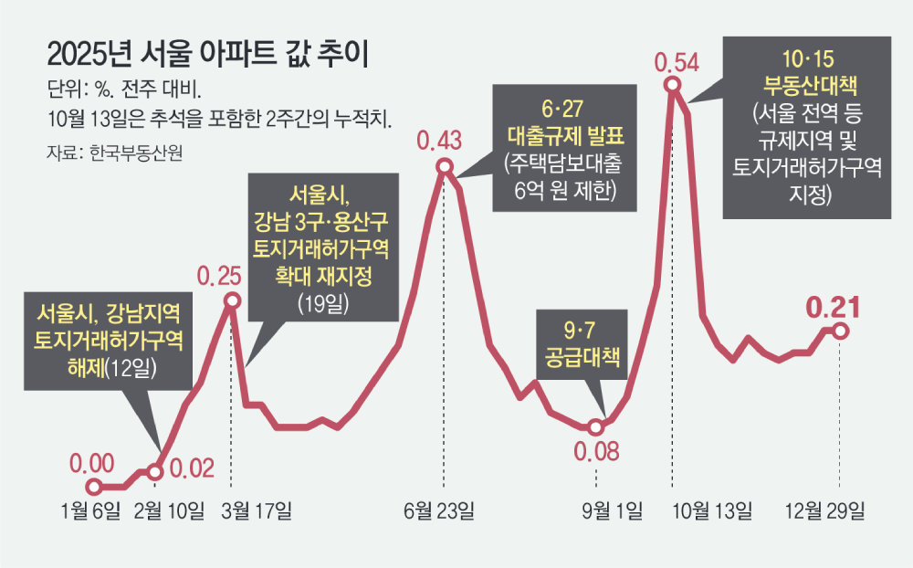 2025년 서울 아파트값이 지난해 2월부터 47주 연속 상승하며 19년 만에 최대로 올랐다. 송파구(20.92%), 성동구(19.12%) 등 강남권과 ‘한강벨트’ 집값이 서울 전체(8.71%)의 2배 이상으로 뛰며 전체 상승세를 이끌었다는 분석이 나온다. 반면 중랑구(0.79%), 도봉구(0.89%) 등 서울 외곽은 1%에도 못 미치는 상승률을 보였다. 올해 서울의 아파트 입주 물량이 지난해보다 30%가량 줄어드는 등 공급 부족이 지속될 가능성이 높아 집값 안정을 위해서는 ‘똘똘한 한 채’ 쏠림을 해소하고 확실한 공급책을 내놔야 한다는 지적이 나온다.● 서울 집값 격차 역대 가장 커1일 한국부동산원이 발표한 주간 아파트 가격 동향(지난해 12월 29일 기준)에 따르면 지난해 12월 다섯째 주 서울 아파트값은 전주(0.21%)보다 0.21% 올랐다. 2월 첫째 주 상승 전환한 후 47주 연속 상승했다. 2025년 연간 누적 상승률은 8.71%로 2012년 부동산원 통계 집계 이래