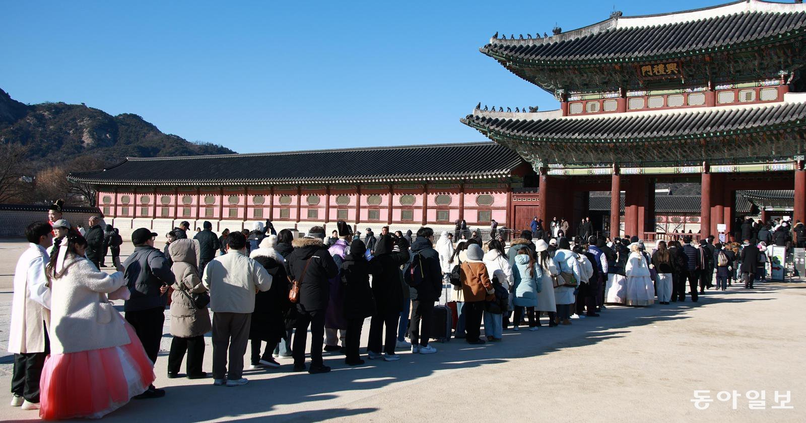 1일 추운 날씨 속에서도 경복궁을 찾은 관람객들이 패딩점퍼와 모자 등으로 중무장한 채 길게 줄 서 있다. 이날 서울은 체감온도가 영하 10도 이하로 떨어지는 등 강추위가 이어졌다.