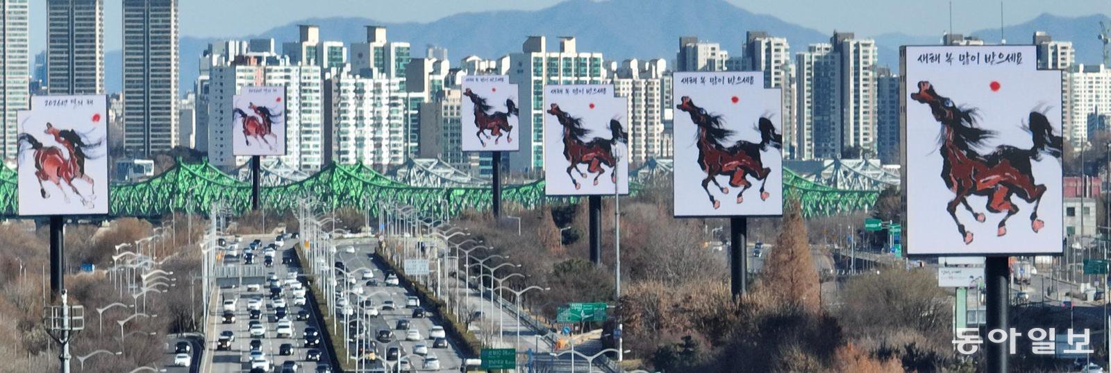 ‘붉은 말의 해’인 2026년 병오년(丙午年)을 맞아 1일 서울 영등포구 여의상류 나들목(IC) 부근 도로 옥외광고 전광판에 말이 그려진 영상물이 송출되고 있다.
