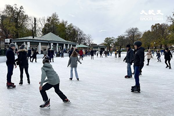 2022年12月,波士顿公共公园(Boston Common)的青蛙池塘(Frog Pond)溜冰场里有很多游客。(刘景烨/大纪元)