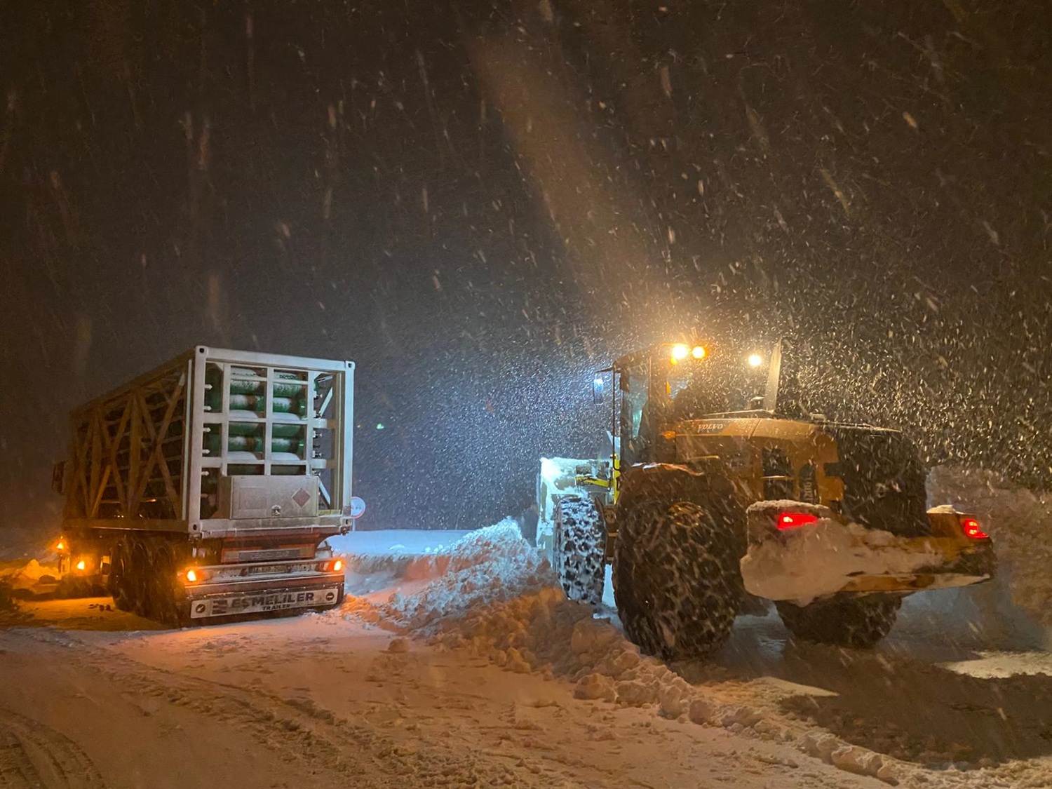 Bitlis'in Hizan ilçesinde kar ve tipi nedeniyle Panor Dağı'nda mahsur kalan doğal gaz tankeri ekiplerin çalışması sonucu kurtarıldı.