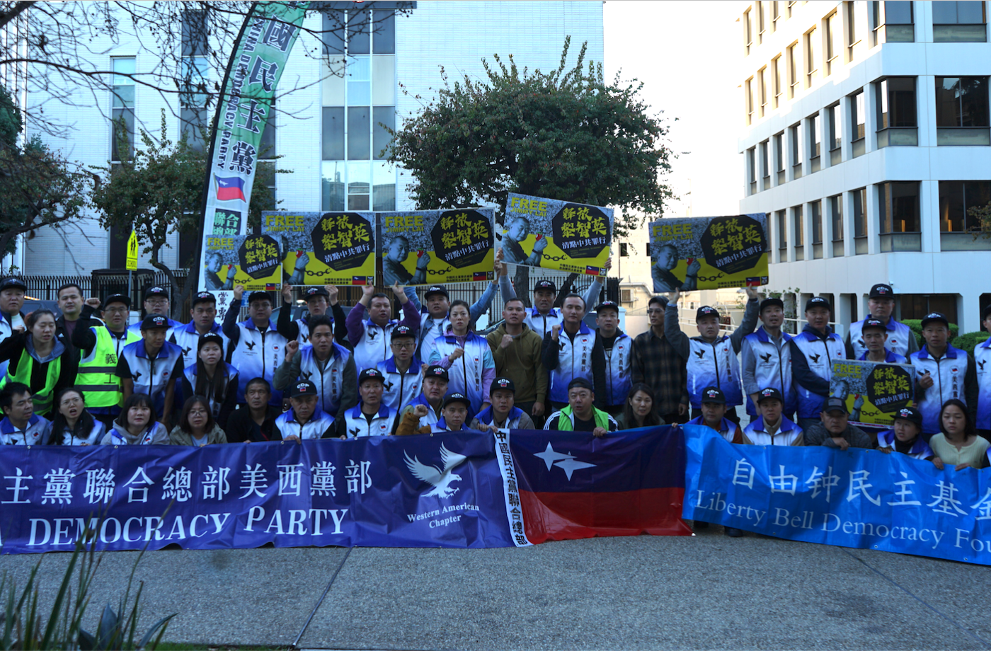 2025年12月28日,中国民主党美西党部成员及支持者到洛杉矶中共领馆门前抗议,要求无罪释放黎智英。(主办方提供)