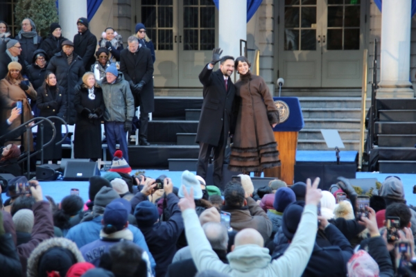 纽约市长马姆达尼与妻子在典礼上向市民挥手致意。(黄小堂/大纪元)