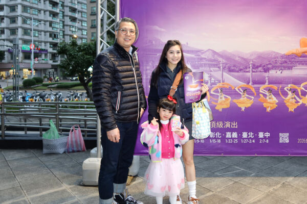 2026年1月1日午,市内装修设计公司总监谢尚轩(左)与家人一起观赏神韵新纪元艺术团在台湾戏曲中心的第三场演出。(龙芳/大纪元)