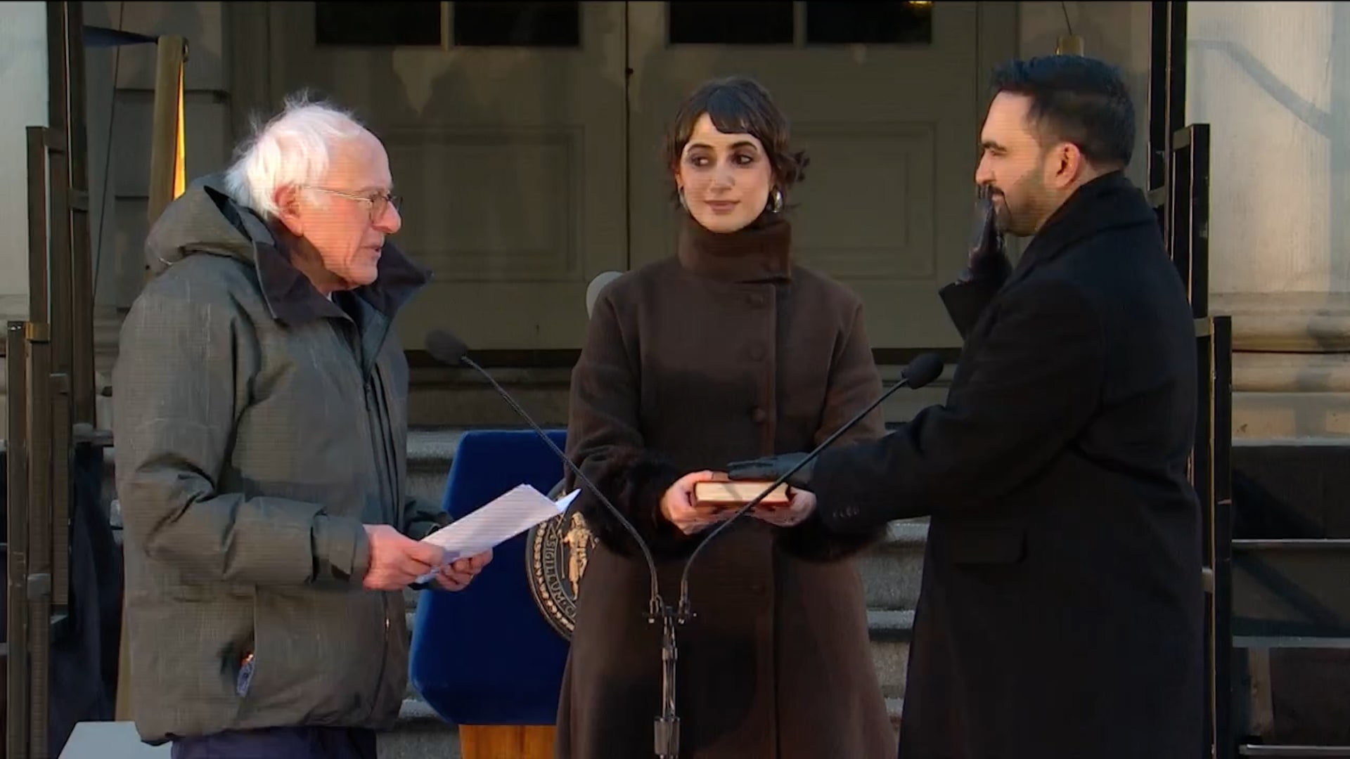 أملى السيناتور المستقل بيرني ساندرز، ممثل ولاية فيرمونت، اليمين الدستورية على عمدة مدينة نيويورك، زهران ممداني، أمام الجمهور في حفل أقيم خارج مبنى البلدية.