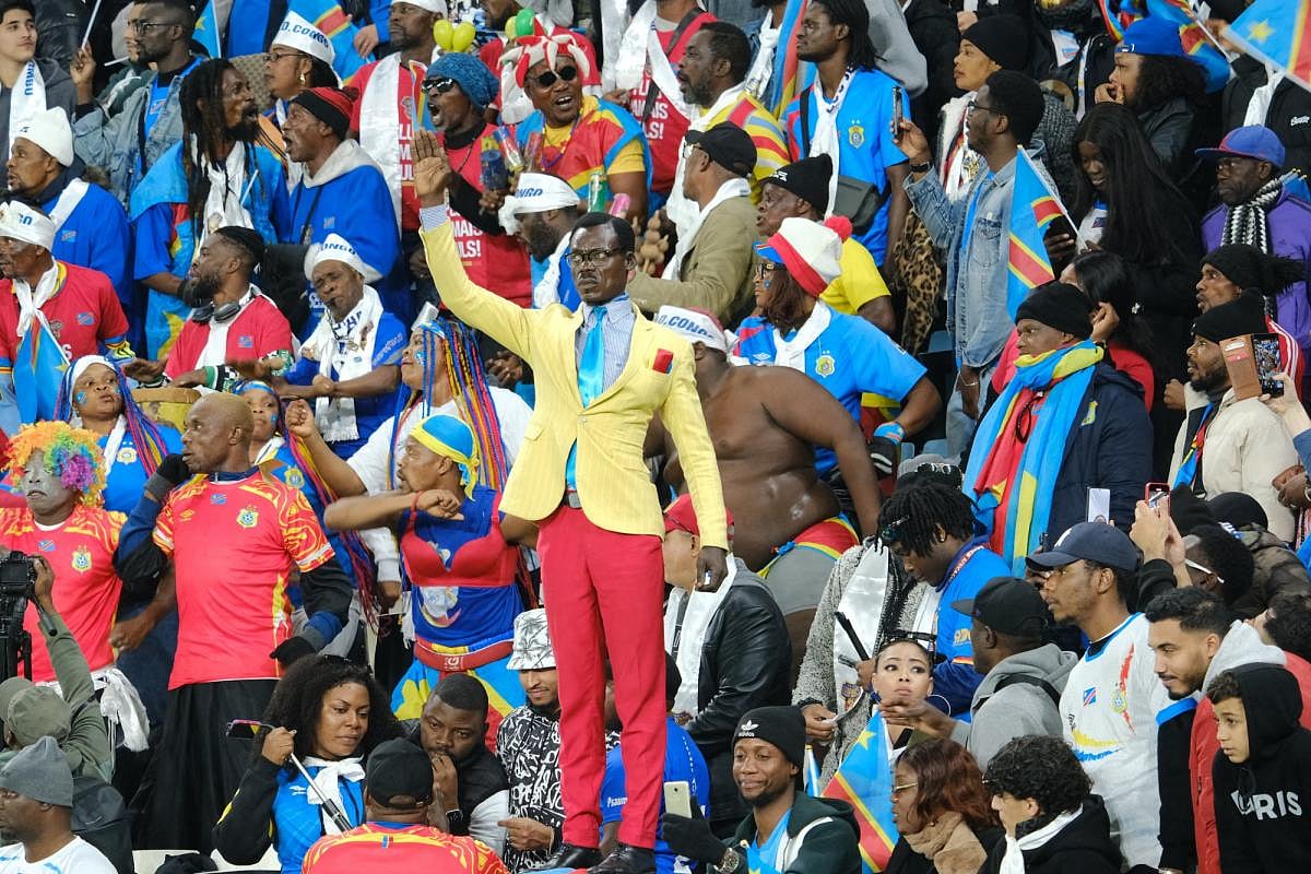 আফ্রিকান কাপ অব নেশনসে কঙ্গোর সমর্থক মিশেল কুকা এমবোলাডিঙ্গা ভাস্কর্যের মতো দাঁড়িয়ে প্যাট্রিক লুমুম্বাকে স্মরণ করাচ্ছেন।