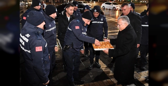 Kayseri Büyükşehir Belediye Başkanı Memduh Büyükkılıç, yılbaşı gecesi şehrin huzuru için görev yapan polis, itfaiye ve zabıta ekiplerini ziyaret ederek teşekkür etti ve yeni yıllarını kutladı.