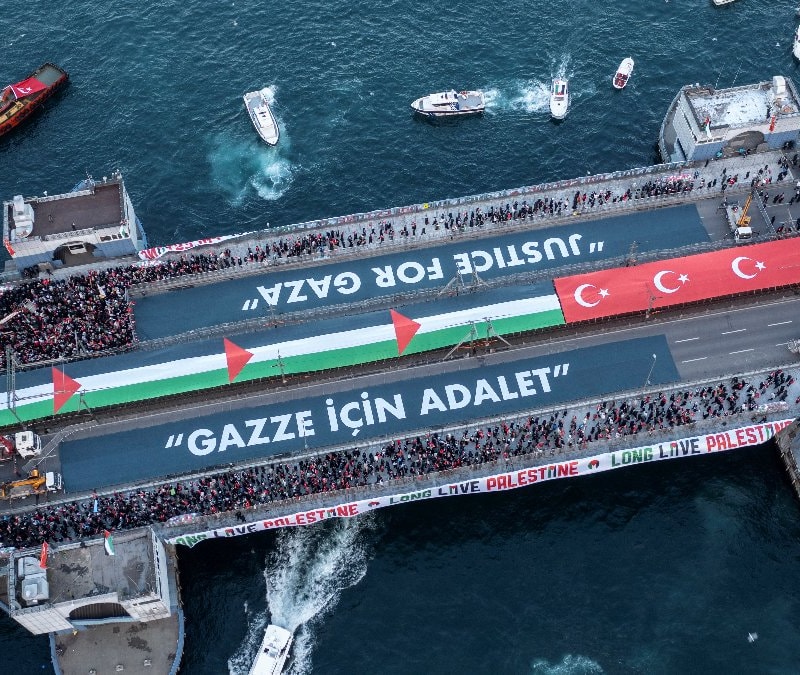 Galata Köprüsü'nde "Sinmiyoruz, susmuyoruz, Filistin'i unutmuyoruz" sloganıyla düzenlenen Filistin'e destek yürüyüşü dünya medyasında yer aldı.