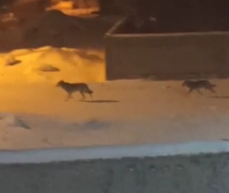 Başkale ilçesinde kış şartlarında yiyecek bulmakta zorluk çeken kurtlar, gece saatlerinde ilçe merkezine inerek yiyecek aradı.