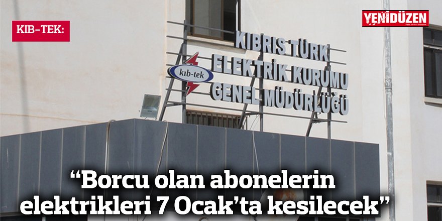 "Borcu olan abonelerin elektrikleri 7 Ocak'ta kesilecek" Kıbrıs Türk Elektrik Kurumu (KIB-TEK), 675 TL ve üzeri borcu olanların elektriklerinin 7 Ocak Çarşamba günü kesileceğini duyurdu.