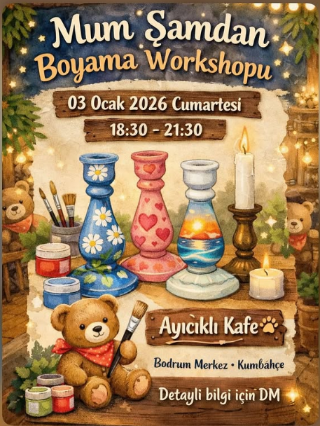 Bodrum Kumbahçe’nin sevilen mekanı Ayıcıklı Kafe, yaratıcılığını konuşturmak isteyenleri keyifli bir atölye çalışmasında buluşturuyor. 3 Ocak Cumartesi akşamı düzenlenecek Mum Şamdan Boyama Workshopu ile katılımcılar kendi özgün tasarımlarını oluşturacak. Bodrum’un kalbinde, sanat ve kahve keyfini bir araya getiren etkinliklere bir yenisi daha ekleniyor. Kumbahçe sahilinin sıcak atmosferine ev sahipliği yapan Ayıcıklı Kafe, sanatseverler için özel […] The post Bodrum’da Sanat Dolu Akşam: Ayıcıklı Kafe’de Mum Şamdan Boyama Workshopu first appeared on Bodrum’da Bugün .