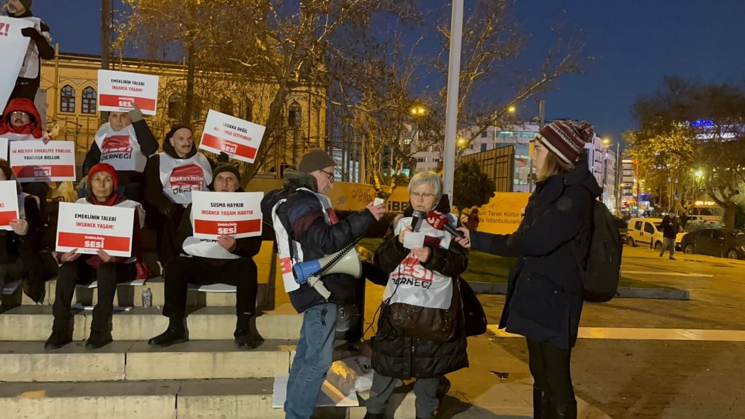 Emeklinin Sesi Derneği üyeleri, İstanbul Kadıköy’de düzenledikleri oturma eyleminde düşük emekli maaşlarını ve artan yaşam maliyetlerini protesto etti, “İnsanca bir yaşam istiyoruz” çağrısı yaptı.