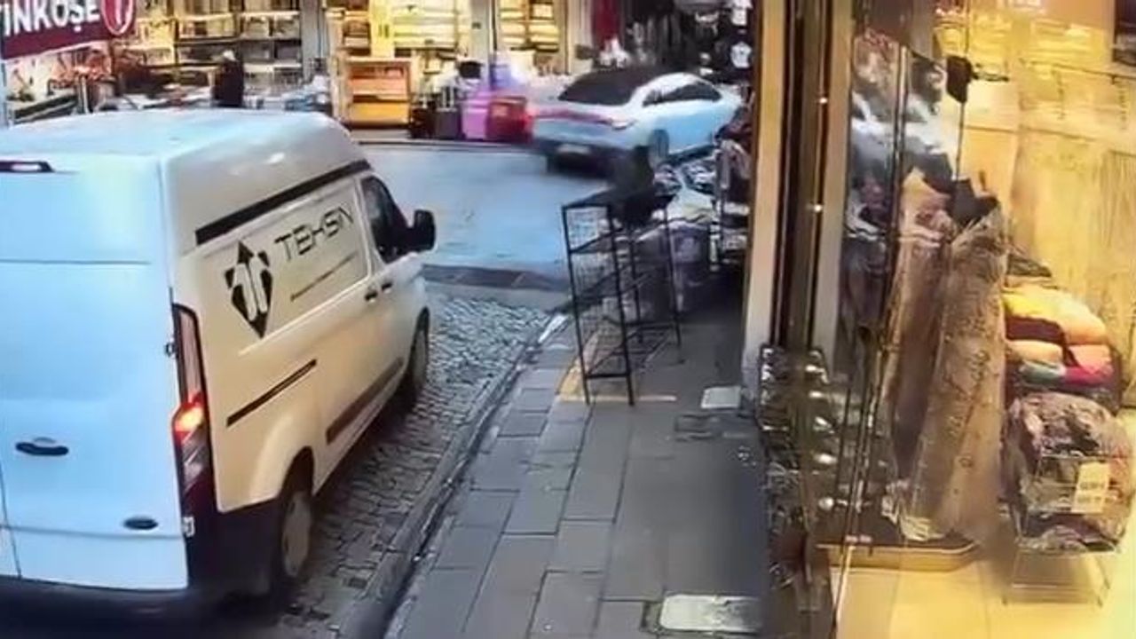 Fatih'te iddiaya göre fren yerine gaza basan sürücü önce motosiklete ardından da çanta satışı yapılan dükkanın önündekilere çarptı. 4 kişinin yaralandığı kaza güvenlik kamerasına yansıdı.