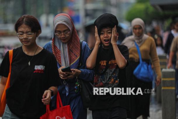REPUBLIKA.CO.ID, JAKARTA -- Warga menggunakan payung saat berjalan di kawasan Bundaran Hotel Indonesia, Jakarta, Jumat (2/1/2026). Badan Meteorologi Klimatologi dan Geofisika (BMKG) mengimbau masyarakat untuk waspada terhadap potensi cuaca ekstrem yang...