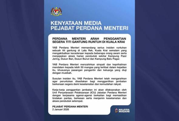Perdana Menteri Datuk Seri Anwar Ibrahim hari ini mengarahkan agar peruntukan disediakan bagi menggantikan segera titi gantung yang runtuh di Lata Rek, Kuala Krai, Kelantan, semalam.