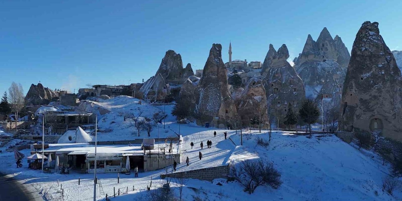 UNESCO Dünya Mirası Listesi’nde yer alan Kapadokya’da olumsuz hava koşulları nedeniyle yaklaşık bir haftadır yapılamayan sıcak hava balon turları, kar yağışının ardından yeniden başladı; bölge ziyaretçilere kartpostallık görüntüler sundu.