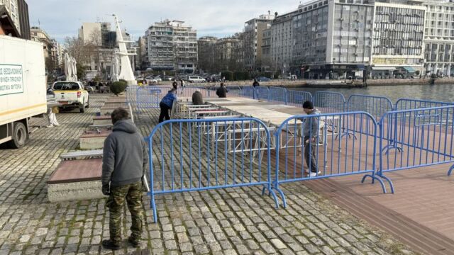 Συνεργεία του Δήμου της Θεσσαλονίκης τοποθετούν εξέδρες και προστευτικά κιγκλιδώματα, ώστε να είναι όλα έτοιμα για τον εορτασμό των φετινών Θεοφανίων