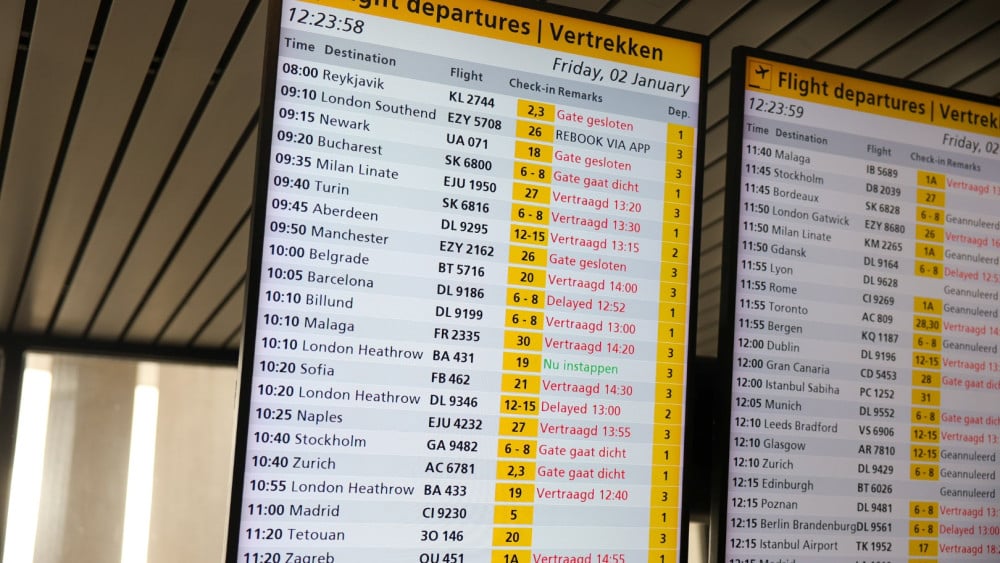 Geduld is een schone zaak voor wie vandaag van of naar Schiphol vliegt. Vanwege het winterse weer zijn talloze vluchten geschrapt of vertraagd. Wie dat op tijd hoort, kan thuis, voor de security of bij de gate op de (volgende) vlucht wachten. Sommige passagiers hebben meer pech, en moeten na het boarden nog lange tijd wachten op de take-off. Of na aankomst op Schiphol voordat ze het vliegtuig kunnen verlaten. Een woordvoerder van Schiphol bevestigt dat dat laatste 'door het verstoorde vluchtschema inderdaad kan voorkomen'. Omdat vliegtuigen voor vertrek ijsvrij moeten worden gemaakt, kan Schiphol bij winters weer als vandaag minder vluchten afhandelen dan gebruikelijk. Sinds vanochtend worden daarom uit voorzorg vluchten geschrapt . Inmiddels zijn al honderden vluchten uit het schema gehaald. Vluchten die wel vertrekken, zijn vrijwel allemaal vertraagd. Het ijsvrij maken van die vliegtuigen kost zoveel tijd dat de betreffende vluchten veelal uren later dan de geplande vertrektijd opstijgen. Bovendien staan die vliegtuigen langer aan de gate dan gepland, waardoor binnenkomende vluchten op hun beurt weer moeten wachten tot er een plek aan de gate vrij komt. Dat laatste gold vanochtend onder meer voor vluchten uit Salt Lake City (VS) en Bonaire. Passagiers in die toestellen moesten na de landing nog een half uur tot een uur wachten voor ze het vliegtuig konden verlaten. Ook de wind speelt Schiphol vandaag parten. Vanwege de westenwind wordt alleen de Buitenveldertbaan gebruikt voor binnenkomende vluchten. Daardoor zijn ook sommige vluchten van luchthavens in het buitenland naar Schiphol vertraagd. Een passagier op een vlucht van Parijs naar Schiphol meldde vanmiddag op sociale media dat ze al in het vliegtuig zat, maar voorlopig nog niet zou vertrekken. "Vanwege het slechte weer is er maar één landingsbaan op Schiphol in gebruik. Waarschijnlijk vertrekken we over een uurtje."