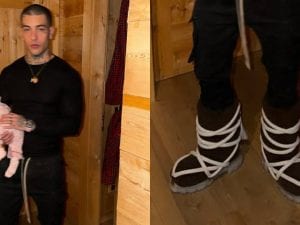 Il look da neve di Tony Effe è “lunare”: i maxi stivali con le corde costano 2mila euro