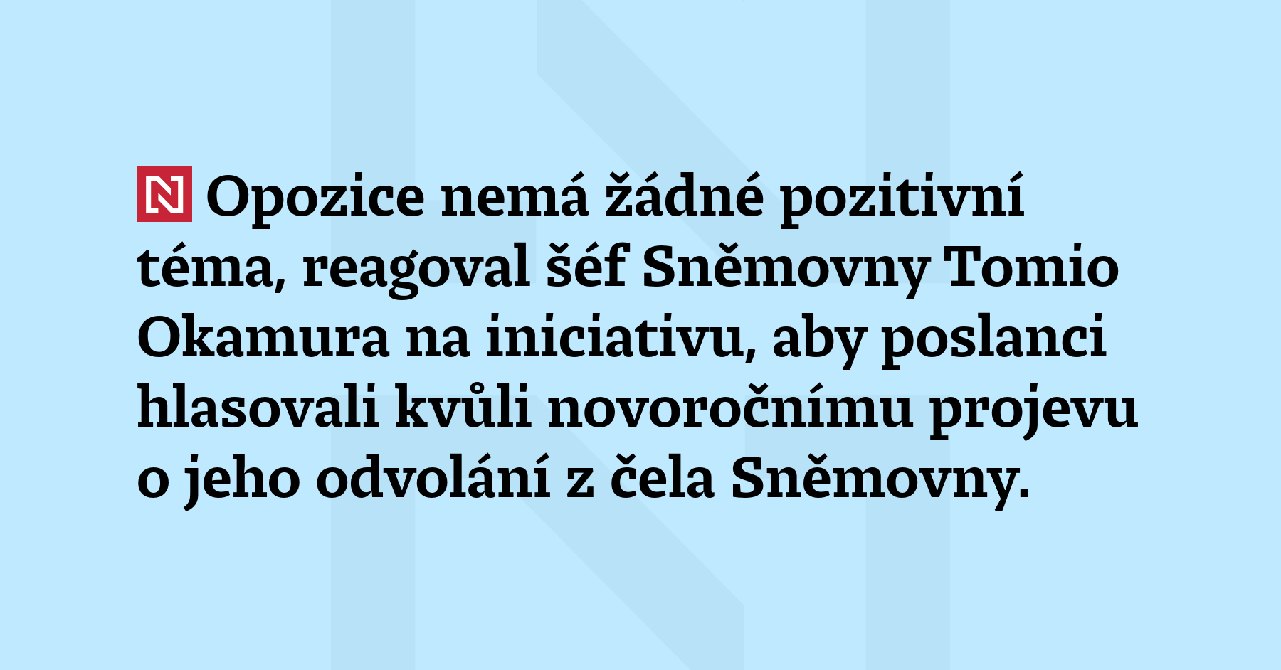 Opozice nemá žádné pozitivní téma, reagoval šéf Sněmovny Tomio Okamura na iniciativu, aby poslanci hlasovali kvůli novoročnímu projevu o jeho odvolání z čela Sněmovny. (ČTK)