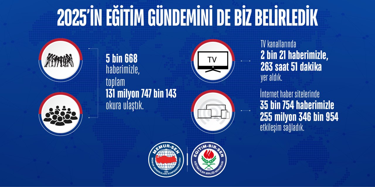 Eğitim-Bir-Sen, 2025 medya raporunu açıkladı. Sendika, yıl boyunca 43 bin 443 haberde yer aldığını; yazılı basında 131 milyon okura, dijitalde 255 milyon etkileşime ulaştığını duyurdu.