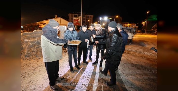 Erzurum'un Aziziye ilçesinde, kar mücadelesi veren belediye ekiplerine Başkan Emrullah Akpunar tarafından çay ve baklava ikram edilerek moral verildi.
