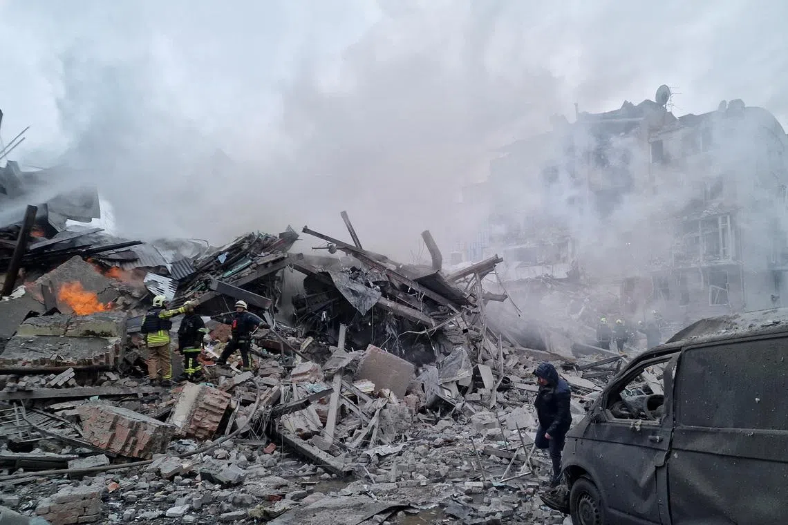 KYIV, Jan 2 - Russian missiles struck a multi-storey apartment building in Kharkiv in northeastern Ukraine on Friday, leaving the building in ruins and injuring at least 25 people, officials said.